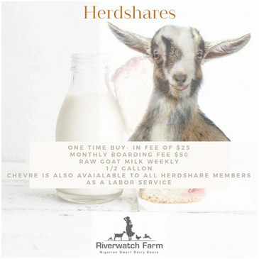Send us an email to riverwatchfarm@gmail.com or text us at (757) 585-5218 and we will set up a time to have you out to show you our set up and explain our pick up and delivery protocols as well as safe raw handling procedures. At this meeting you will sign a Herdshare Contract and pay for your share ($25.00) as well as your first month's boarding ($50.00). You are also welcome to try the milk and make sure that you love the creamy texture and flavor of Nigerian Dwarf goat milk.